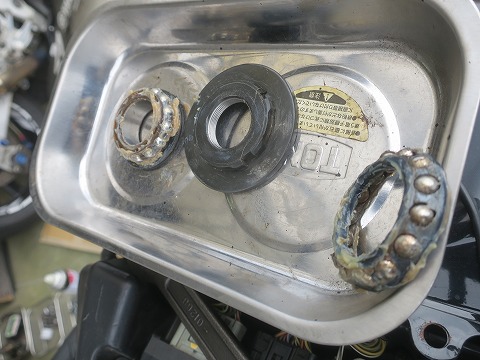 14:35 アジャスト ナットは 外した上下のベアリング。 軽く茶色くなっている箇所がありました。 真ん中の黒い輪っかは、ベアリングを押さえているアジャスト ナット。 このナットの締め付け具合で、ステアリングのベアリングの締め付ける強さを加減する重要な部品だす。 |
