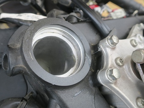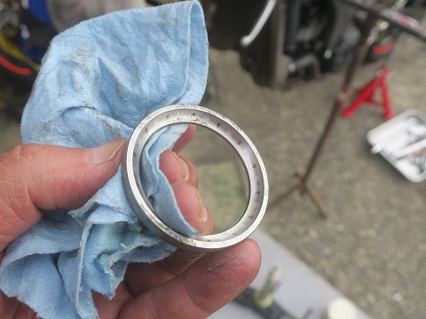 15:02 アウタ レースを こっちは車体側に付くボールベアリングのアウタ レース。 付いていた古い方の部品ですが、こっちにもボールベアリングが当たっていた箇所が磨かれちゃってます。 指で触ってみましたが、ほどんど凹みとかはわかりませんでした。 |