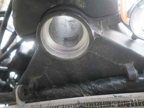 14:34 アウタ レース 三又を抜いたあとのステアリングヘッド。 クリーム色のはグリスで、グリスが付着している銀色のところがベアリングの受け側の部品でアッパ ベアリングのアウタ レースって名前。 上下に1セットづつ付いてます。 |