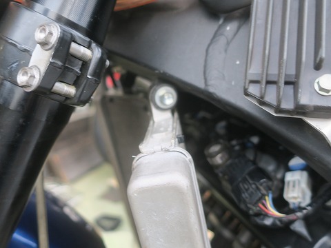 14:10 ステアリング ダンパーを トップブリッジは当然外すので、その前にフロント側とつながっているステアリング ダンパーのネジも外しておきます。 ボルトにワッシャーが入っているんだけど、落っこちやすいので、注意ね。 (自分、落っことして行方不明。 組むときに新しいワッシャを使いました) |