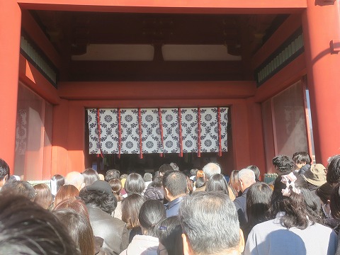 12:34 お参りします。 本宮の入口から、さらにノロノロと進みます。 この先でお参りをしていますが、撮影禁止なので、写真はここまで。 |