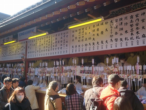 12:42 お札や絵馬、破魔矢、お守りなど お参りしてきました。 本宮からの離脱は、左に折れて。 帰り道には、お札や絵馬、破魔矢、お守りを販売しています。 街中華のお品書きの様に凄い種類の商品(?)が並んでいます。 願いを全部叶えようと思ったら、結構なお金がかかりますね。(笑) |