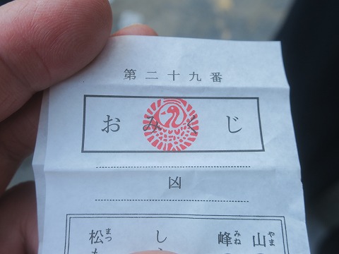 12:48 がっかり かなりガッカリしながら、山道を下ります。 おみくじには、「二つを同時に願ってはならぬ」って書いてありました。 お参りの時に、「今年も無事に過ごせること」と、今年資格試験に挑戦しようと思ってて、「合格お願い」って、二つお願いしたんですよね、100円のお賽銭で。 それを見透かされたね。 間違いない。(笑) |