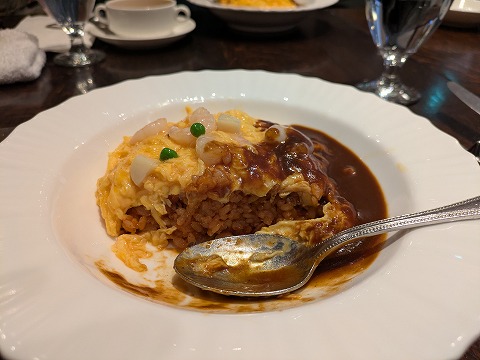 14:17 デミグラスソースが オムレツライスのオムレツは薄焼きのタマゴではなく、フワフワのトロトロのタイプのものです。 タマゴの上に載っている白いのはエビ。 いいアクセントになっています。 オムレツの中身のライスは、ケチャップライスではなくて、酸味がなく上品な味付けです。 お店の案内を見たら、よくある炒めたケチャップライスではなくて、野菜とブイヨンで炊き上げたものらしいです。 デミグラスソースは、深みがあって上品な味で、美味しいですね。 ただ、個人的には体を動かすことが多い自分には塩味がもう少し欲しいところですが、お店の周辺の事務所で働いている人には、このくらいの塩味の方が好まれるんでしょうね。 「うん、美味しい。」 |