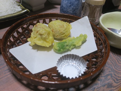 18:41 天ぷら 最後に運ばれてきたのは天ぷら。 料理たっぷりです。 天ぷらはシシトウと丸っこいのは自家製の魚の練り物ポイですね。 これも美味しい。 |