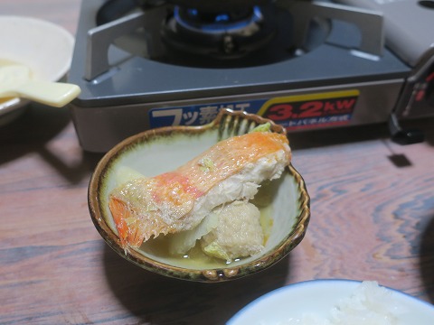 18:07 鍋は 鍋もあります。 鍋には、伊豆を代表するキンメダイ、カニ、ここにもエビが居ました。(笑) カセットコンロの火を付けておきましょう。 |