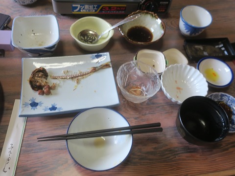 7:41 朝食 7時半を過ぎて朝食の時間になりました。 朝食も部屋食です。 前回訪れた2019年の3月の時は1階の1階の大広間でしたけどね。 covid-19の対策でしょう。 それでは、ご飯を盛ったら「いただきましょう。」 アジの干物は定番ですね。 |