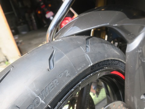 14:47 スリップマーク直前 今付いているリヤタイヤ。 スリップマークが出るまで、もうちょっと。 ロングツーリングには耐えられそうもないので、交換です。 |