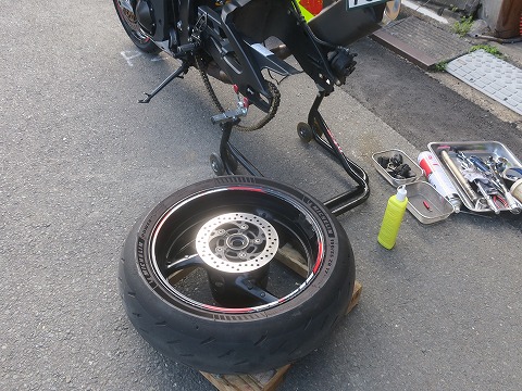 15:18 組んでいく 新しいタイヤを組んでいきます。 MICHELIN のPOWER GP2 も POWER GPと同じようにケースは柔らかいので、組付けるのが楽。 |