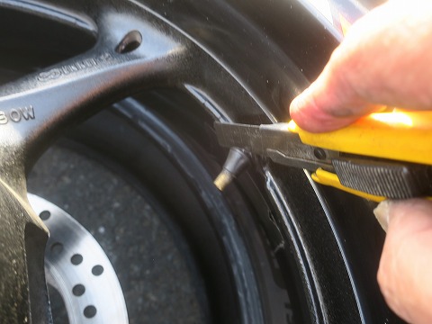 11:15 古いバルブを まずは、いままで付いていた古いエアーバルブをカッターナイフを使って切り落としちゃいます。 |