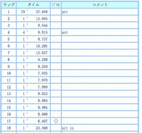 10:10〜10:30 走行1本目 1本目のラップタイム。 いつもの様に徐々にタイムを上げていきます。 3周目にピットに入ってるんだね。 何のためにピットに入ったか忘れました。 (-_-;) その後、再度コースイン。 6周目、7周目後続を待ってペースダウン。 去年の走行会の時にGPSラップタイマーを落としてしまったので、走行中にタイムは分かりません。 次回までにGPSのラップタイマーを入手したいところです。 8周目から淡々と走って、最後の17周目にポンと6秒台で、6秒4。 ピットインします。 |