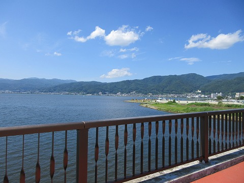 おんやど鯉住を出発して、左手に諏訪湖を眺めながら、自転車を漕ぎます。