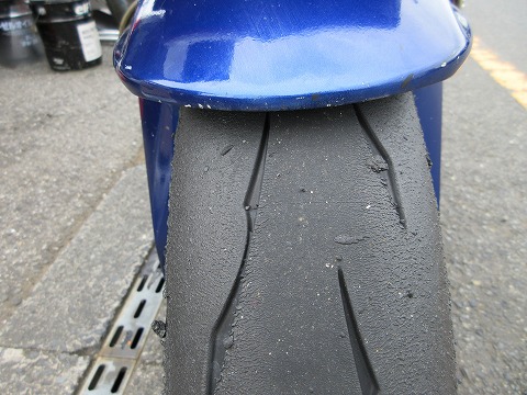 10:36 走行後のリヤタイヤは 走行後のタイヤの確認。 まずリヤタイヤ側。 タイムもタイムですから、比較的きれいに減ってます。 今回は、ブリヂストンのHPに記載してある冷間の推奨空気圧からタイヤウォーマーをかけて、走行前に210kPaまで空気圧が上がった状態で走行をしました。 走った感じとしては、ちょっとエアー圧が高すぎる様に感じました。 自分の感覚としては、もう少し下げたいところです。 ただ、下げ過ぎてしまうとトラブルが出たりする可能性もあり怖いです。 実際に走るときは、皆さんどの程度の空気圧で走行しているのか、情報を集めないとですね。 |
