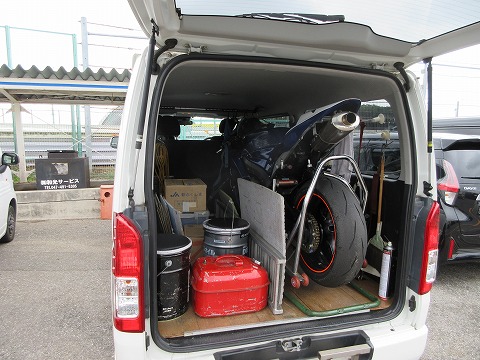 10:53 積込み中 タイヤも処分できて、ハイエースに積込みも終わりました。 CBRはまだ熱々なので、このままだと、エアコン入れても暑いです。 冷えるまで少し時間を潰します。 |