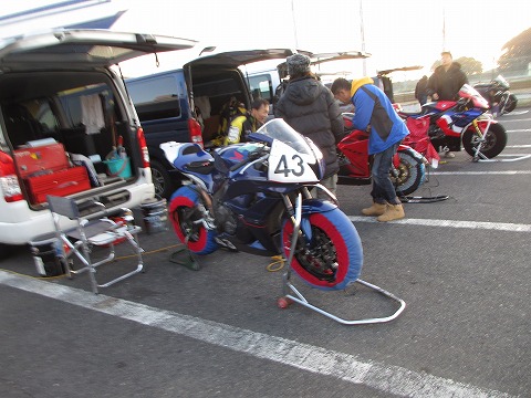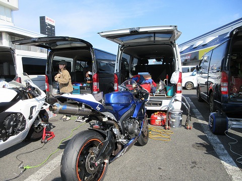 6:3 さっそく準備 駐める場所が決まったら、さっそくCBRを下ろして、タイヤウォーマを巻いて、走行の準備を始めます。 11月になって気温も下がってきたので、タイヤもしっかり温めたいところです。 この駐車エリアは、隣同士が狭いですね。 |