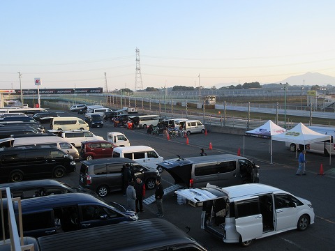 6:52 いつもの駐車スペースは 走行券発売10分前になったので、走行券を買いにコントロールタワー脇の2階へ。 いつもハイエースを駐めているS字側の駐車スペースは、明日レースがあるみたいで協賛者用のスペースとして駐められないようにカラーコーンが置いてありますね。 そして出店のテントも張られています。 今日は雲もなく、この時期らしい、いい天気です。 |