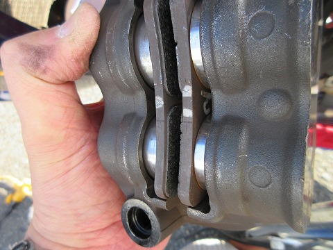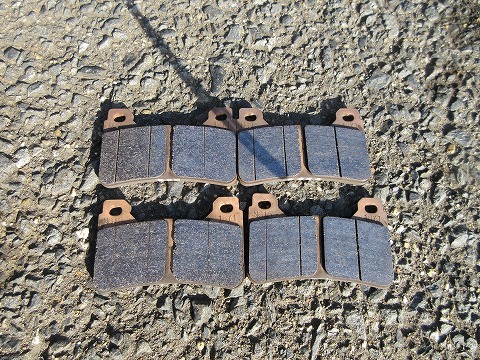 8:54 外したパッド 外して交換します。 左下のパッドは、もう溝が見えないくらいまで減ってますね。 |