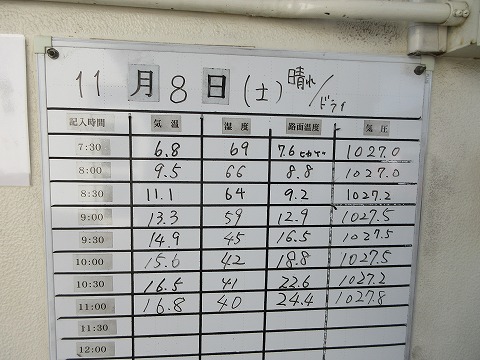 11:03 今日のコンディションは 腕章を返却したら、コースインゲート脇のコンディションボードを確認。 1本目が8:00〜8:20だったので、 8時の気温9.5℃、路面温度8.8℃ 8時半の気温 11.1℃、路面温度9.2℃ 2本目が9:40〜10:00だったので、 9時半の気温14.9℃、路面温度16.5℃ 10時の気温15.6℃、路面温度18.8℃ 9月末から1ヶ月半で、ずいぶんと涼しくなったね。 2本目走った9時40分から10時とか、タイム出しやすいコンディションですね。 |
