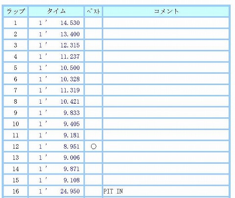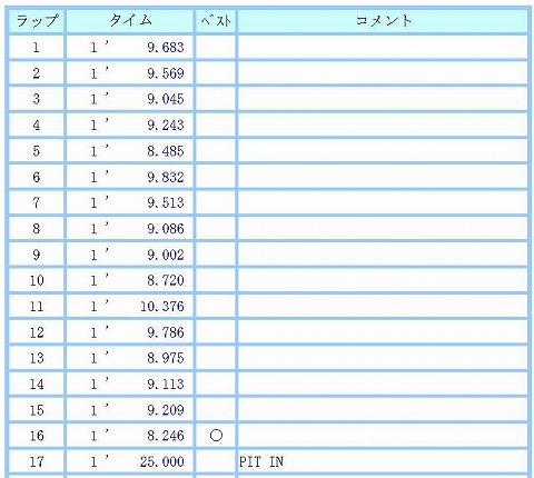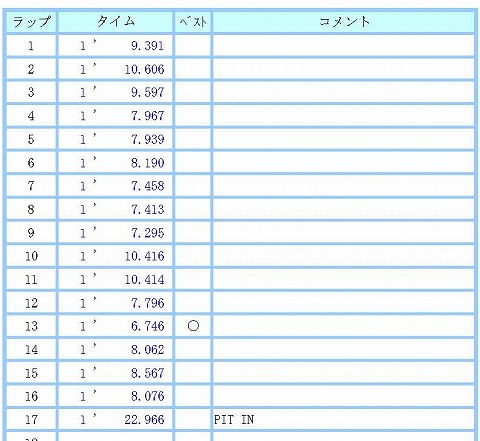 10:05〜10:25 B2クラス 10時5分になって、今日2本目の走行です。 気温も上がって10℃を越えてきて、路面温度も13℃と極端に冷たくないので、ある程度のグリップは期待できそうです。 1本目の走行が(タイムが)酷かったので、もう少しペースを上げて走りたいと思います。 1〜3周くらいは様子を見て。 4周目くらいからペースを上げます。 4周目からは基本7秒台で周回。 10周目、11周目はイエローフラッグでも出ていたのかな? (記録がなかったので、今となっては理由がわかりません) 12周目からペースを戻して、13周目にこの走行のベストで6秒7。 その後も走行を続けますが、疲れちゃったのかな、8秒台のタイムで3周回して、17周目にチェッカーが出て、この回の走行は終了でピットインします。 |