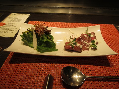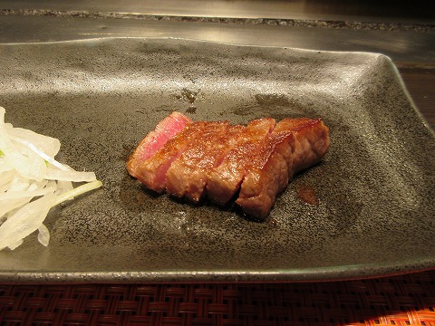 19:11 さらに追加 さらに追加。(笑) この辺りで、注文できる時間の75分が近づいてきました。 コックさんが、「まだ食べられるんでしたら、2つとか注文できますよ」とのこと。 せっかくなので、2つ注文しました。 出てきたのは”シンタマ”。 これも知らんがな。(笑) 後脚の付け根にある部位だそうです。 弾力がありますね。 |