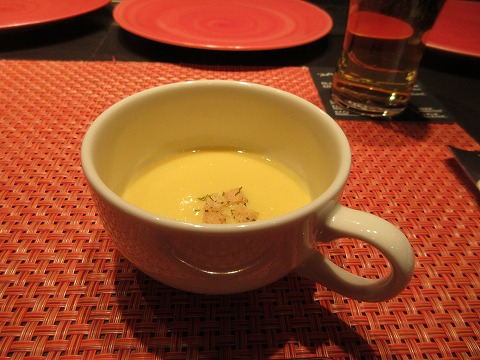 18:13 本日のスープは 鉄板の上で調理が進む中、スープが運ばれてきました。 コーンスープ。 コーンの甘味が凄いです。 |