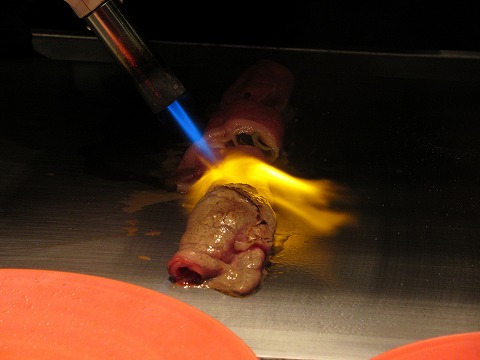 18:14 割りしたの 鉄板の上では、焼き上げた肉にすき焼きの割りした味付けのソースが絡められ、最後にバーナーで炙っていきます。 |