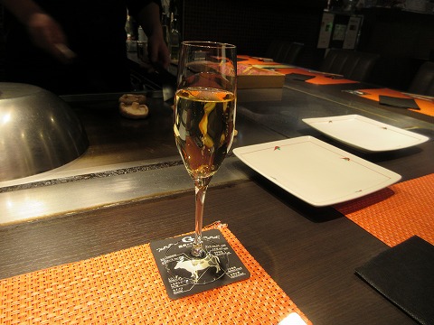 18:00 口開けは 6時になり、調理がスタートです。 隣のお二人様とは、同じコース、同じオペレーションで進みます。 まずは飲物で、最初は生ビール。 ビールはアサヒ スーパードライ。 それでは、(ほぼ)1年ぶりの再開を祝して、乾杯! |