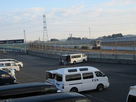 7:53 クルマ少なし 走行券の販売開始を待っている間、パドックを眺めると、いわゆるS字裏って所に駐まっているのは、自分のハイエースだけ。(笑) |