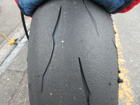 9:42 走行後のリヤタイヤ 1本目の走行が終わってパドックに戻ってきました。 いつものタイヤの表面チェック。 リヤタイヤ側、一番端っこは使ってませんね。 右側の端っこにはタイヤカスが残っています。 左側は、タイヤカスが出るほどもペースが上がってないんだね。 ダメじゃん。 立ち上がりでアクセルを開けていく、右側中間部分の溝が薄くなってきてますね。 タイヤが終わりが近いです。 前使ってたPIRELLIは溝が無くなってもグリップしてたけど、BSのR11はどうなんでしょうね。 ただ、溝が無くなると、見ているだけど精神衛生上よくないです。(笑) |