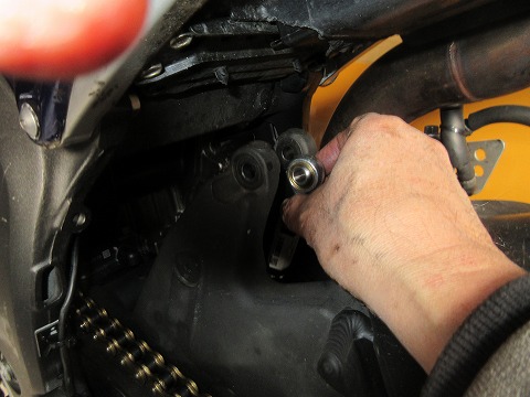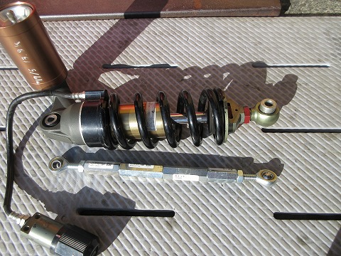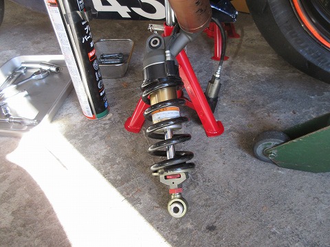 9:54 リヤサスペンションを外す ステップ スタンドをかけたら、リヤサスペンションに荷重がかからない状態にして、上下の取付ボルトを緩めて、リヤサスペンションを取り外しました。 |