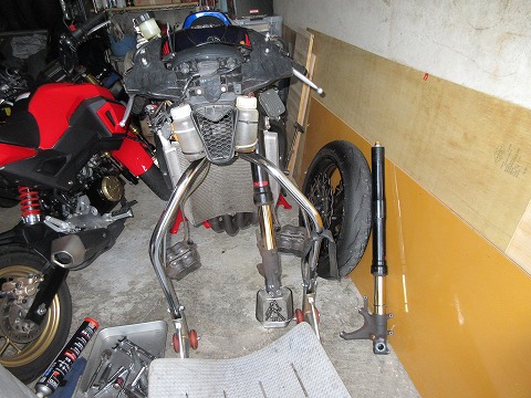 16:35 しばらく放置 と言うことで、フロントフォークを取り外しちゃうと、動かせないので、しばらくこの状態で車庫に放置になります。 |
