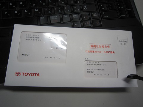 11月の始めにトヨタから”リコールのご案内”が届きました。 仕事の合間を縫って、11月30日の日曜日に持込修理して、完了。 |